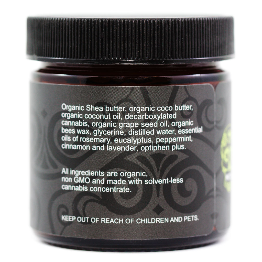 Ingredients: Organic Shea Butter, Organic Coco Butter, Organic Coconut Oil, Decarboxylated Cannabis, Organic Grape Seed Oil, Organic Bees Wax, Glycerine, Distilled Water, Essential Oils of Rosemary, Eucalyptus, Peppermint, Cinnamon and Lavender, Optiphen Plus